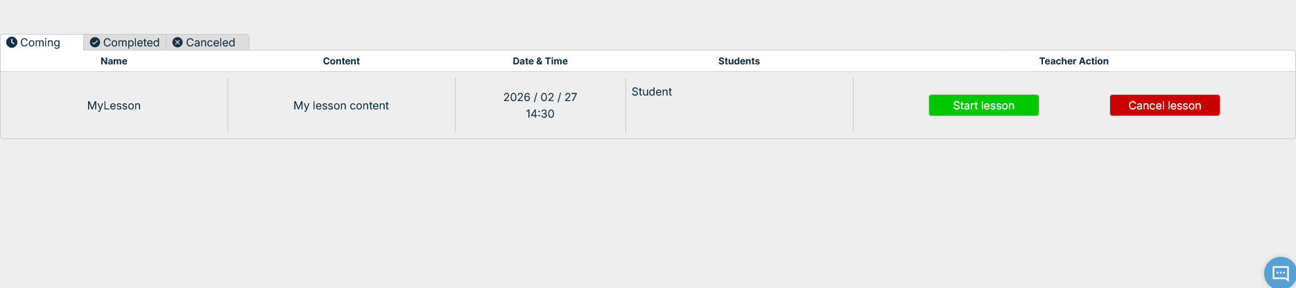 In the Students page, locate your lesson on the bottom of the screen which you wish to start.
