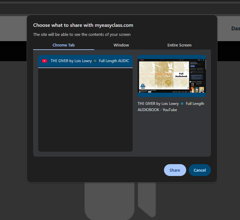 Select the audio you wish to share on your screen.